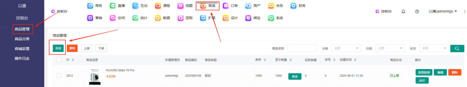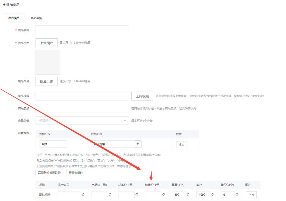 目录 搜索 展开 一、直播前的准备工作1.1.添加主播1.2.添加商品1.2.1.商品标题规范1.2.2.直播间支付解析1.2.3.添加商品分类1.2.4.pc电脑端添加商品1.2.5.手机主播端添加商品1.3.添加外链1.4.添加课程1.5.添加视频(录播/伪直播需要)1.6.添加题库(普通题库、视频题库)1.7.添加优惠券1.8.添加直播间管理员1.9.添加大转盘1.10.积分1.11.红包记录1.12.扩展投票活动1.13.设置快递1.14.添加配送方式1.15.绑定小程序1.16.绑定公众号二、创建直播间2.1.创建手机直播间2.1.1.手机创建手机直播间2.1.2.电脑创建手机直播间预告2.1.3.创建连麦直播间2.2.创建OBS/pc直播2.3.创建录播直播间2.3.1.创建答题直播间2.4.创建伪直播直播间三、给直播间添加商品或外链3.1.电脑端给直播间添加在售商品和讲解卡片3.2.主播端添加在售商品和讲解卡片3.3.给直播间添加在售外链3.4.给直播间添加在售课程四、直播间相关功能/控制4.1.直播间拉黑/禁言用户4.1.1.电脑pc端禁言4.1.2.手机端禁言4.2.直播间发红包/积分/优惠券4.2.1.主播发放优惠券/红包/积分4.2.2.pc端推送优惠券到直播间4.2.3.用户端领取4.2.4.用户发红包4.2.5.直播间发倒计时红包4.2.6.直播间管理发倒计时红包4.2.7.直播间管理员发积分4.3.直播发签到奖励:红包/积分/优惠4.4.直播间清晰度调整4.5.直播间配置调整4.6.直播间添加大转盘4.7.直播间评论区发图片4.8.直播转为伪直播4.9.直播间机器人氛围组4.9.1.添加机器人和评论组/虚拟购买4.9.2.机器人批量/随机发送评论4.9.3.导入机器人评论组4.10.直播间开启长期直播,链接不变4.11.直播间开启录制,视频可回放观看4.12.给用户下发课程链接4.13.下单课程时弹出客服二维码五、直播间更换域名5.1.后台绑定新域名5.2.服务号更换域名5.3.商户号更换域名六、分享直播间(分销)6.1.默认分销比例设置6.2.单独给商品设置分销6.3.上下级关系形成6.4.h5电脑分享直播间6.5.h5手机分享直播间6.6.微信内跳转浏览器打开直播间6.7.下载app打开直播间6.8.小程序打开直播间6.9.查看自己的推荐分享6.9.1.电脑端:有两个查看方式6.9.2.手机端,会员自己查看自己的推荐和业绩6.10.团队管理/pc端查看管理七、订单发货、售后退款7.1.订单发货、退款、状态修改7.2.商家批量发货八、门店8.1.添加门店8.2.给商品添加门店自提和快递邮寄8.3.门店邀请8.4.门店核销 暂无相关搜索结果! 阅读次数:4 本文档使用 MinDoc 发布 1.2.4.pc电脑端添加商品 设置价格添加规格作者:admin 创建时间:2026-01-14 13:30最后编辑:admin 更新时间:2026-01-14 20:13