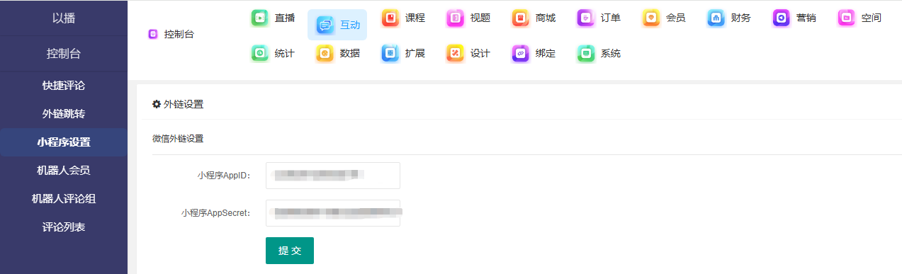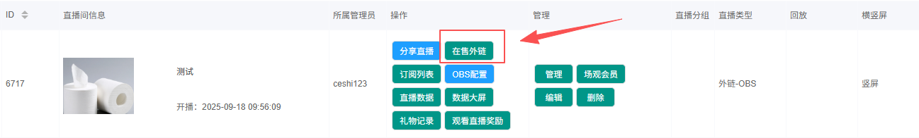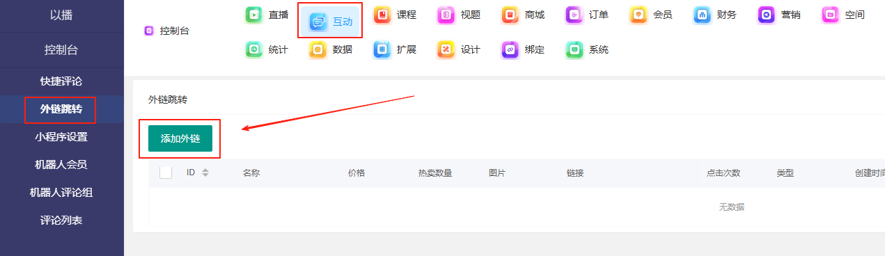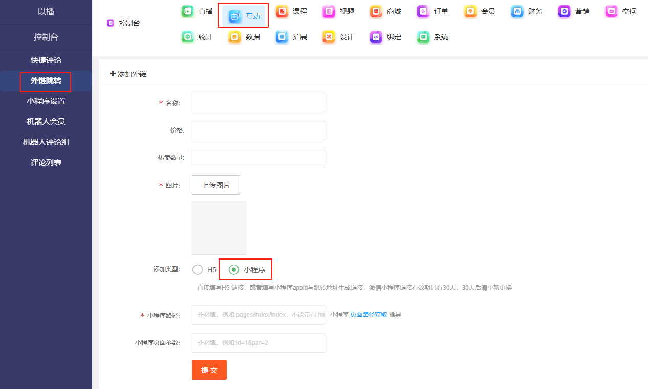 目录 搜索 展开 一、直播前的准备工作1.1.添加主播1.2.添加商品1.2.1.商品标题规范1.2.2.直播间支付解析1.2.3.添加商品分类1.2.4.pc电脑端添加商品1.2.5.手机主播端添加商品1.3.添加外链1.4.添加课程1.5.添加视频(录播/伪直播需要)1.6.添加题库(普通题库、视频题库)1.7.添加优惠券1.8.添加直播间管理员1.9.添加大转盘1.10.积分1.11.红包记录1.12.扩展投票活动1.13.设置快递1.14.添加配送方式1.15.绑定小程序1.16.绑定公众号二、创建直播间2.1.创建手机直播间2.1.1.手机创建手机直播间2.1.2.电脑创建手机直播间预告2.1.3.创建连麦直播间2.2.创建OBS/pc直播2.3.创建录播直播间2.3.1.创建答题直播间2.4.创建伪直播直播间三、给直播间添加商品或外链3.1.电脑端给直播间添加在售商品和讲解卡片3.2.主播端添加在售商品和讲解卡片3.3.给直播间添加在售外链3.4.给直播间添加在售课程四、直播间相关功能/控制4.1.直播间拉黑/禁言用户4.1.1.电脑pc端禁言4.1.2.手机端禁言4.2.直播间发红包/积分/优惠券4.2.1.主播发放优惠券/红包/积分4.2.2.pc端推送优惠券到直播间4.2.3.用户端领取4.2.4.用户发红包4.2.5.直播间发倒计时红包4.2.6.直播间管理发倒计时红包4.2.7.直播间管理员发积分4.3.直播发签到奖励:红包/积分/优惠4.4.直播间清晰度调整4.5.直播间配置调整4.6.直播间添加大转盘4.7.直播间评论区发图片4.8.直播转为伪直播4.9.直播间机器人氛围组4.9.1.添加机器人和评论组/虚拟购买4.9.2.机器人批量/随机发送评论4.9.3.导入机器人评论组4.10.直播间开启长期直播,链接不变4.11.直播间开启录制,视频可回放观看4.12.给用户下发课程链接4.13.下单课程时弹出客服二维码五、直播间更换域名5.1.后台绑定新域名5.2.服务号更换域名5.3.商户号更换域名六、分享直播间(分销)6.1.默认分销比例设置6.2.单独给商品设置分销6.3.上下级关系形成6.4.h5电脑分享直播间6.5.h5手机分享直播间6.6.微信内跳转浏览器打开直播间6.7.下载app打开直播间6.8.小程序打开直播间6.9.查看自己的推荐分享6.9.1.电脑端:有两个查看方式6.9.2.手机端,会员自己查看自己的推荐和业绩6.10.团队管理/pc端查看管理七、订单发货、售后退款7.1.订单发货、退款、状态修改7.2.商家批量发货八、门店8.1.添加门店8.2.给商品添加门店自提和快递邮寄8.3.门店邀请8.4.门店核销 暂无相关搜索结果! 阅读次数:1 本文档使用 MinDoc 发布 1.3.添加外链 添加h5外链和小程序外链,例如你在其他地方有商城或者需要购买的东西 不在我们系统平台的,是讲解弹窗用的 如果需要添加小程序外链,需要先添加小程序 添加小程序外链,举例添加的外链是下面这个链接/pages/goods/goods?id=2033801 作者:admin 创建时间:2026-01-14 13:47最后编辑:admin 更新时间:2026-01-14 20:13