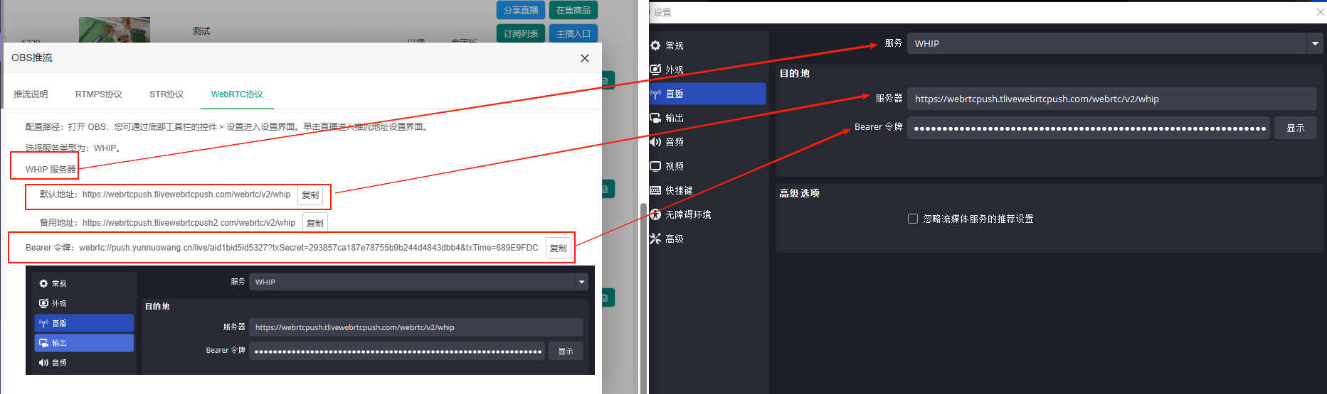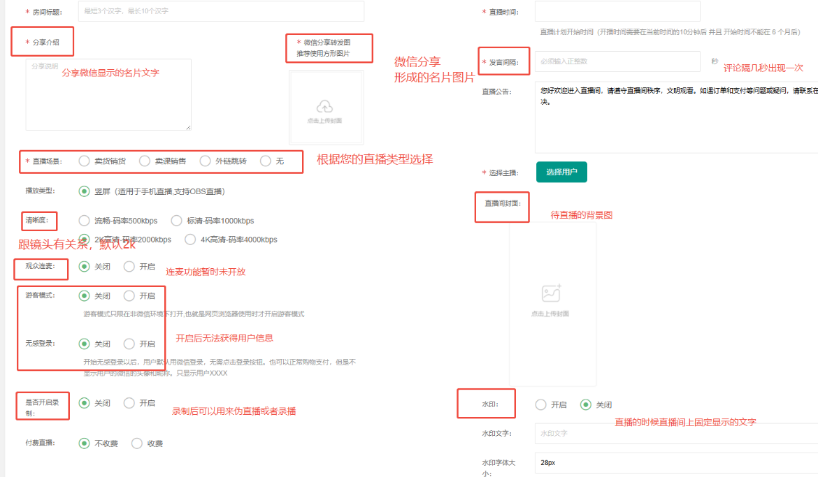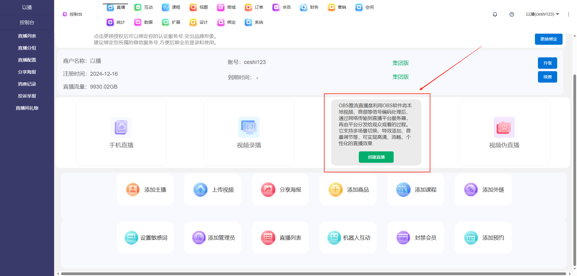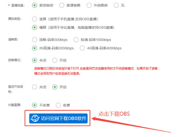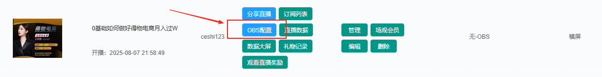 目录 搜索 展开 一、直播前的准备工作1.1.添加主播1.2.添加商品1.2.1.商品标题规范1.2.2.直播间支付解析1.2.3.添加商品分类1.2.4.pc电脑端添加商品1.2.5.手机主播端添加商品1.3.添加外链1.4.添加课程1.5.添加视频(录播/伪直播需要)1.6.添加题库(普通题库、视频题库)1.7.添加优惠券1.8.添加直播间管理员1.9.添加大转盘1.10.积分1.11.红包记录1.12.扩展投票活动1.13.设置快递1.14.添加配送方式1.15.绑定小程序1.16.绑定公众号二、创建直播间2.1.创建手机直播间2.1.1.手机创建手机直播间2.1.2.电脑创建手机直播间预告2.1.3.创建连麦直播间2.2.创建OBS/pc直播2.3.创建录播直播间2.3.1.创建答题直播间2.4.创建伪直播直播间三、给直播间添加商品或外链3.1.电脑端给直播间添加在售商品和讲解卡片3.2.主播端添加在售商品和讲解卡片3.3.给直播间添加在售外链3.4.给直播间添加在售课程四、直播间相关功能/控制4.1.直播间拉黑/禁言用户4.1.1.电脑pc端禁言4.1.2.手机端禁言4.2.直播间发红包/积分/优惠券4.2.1.主播发放优惠券/红包/积分4.2.2.pc端推送优惠券到直播间4.2.3.用户端领取4.2.4.用户发红包4.2.5.直播间发倒计时红包4.2.6.直播间管理发倒计时红包4.2.7.直播间管理员发积分4.3.直播发签到奖励:红包/积分/优惠4.4.直播间清晰度调整4.5.直播间配置调整4.6.直播间添加大转盘4.7.直播间评论区发图片4.8.直播转为伪直播4.9.直播间机器人氛围组4.9.1.添加机器人和评论组/虚拟购买4.9.2.机器人批量/随机发送评论4.9.3.导入机器人评论组4.10.直播间开启长期直播,链接不变4.11.直播间开启录制,视频可回放观看4.12.给用户下发课程链接4.13.下单课程时弹出客服二维码五、直播间更换域名5.1.后台绑定新域名5.2.服务号更换域名5.3.商户号更换域名六、分享直播间(分销)6.1.默认分销比例设置6.2.单独给商品设置分销6.3.上下级关系形成6.4.h5电脑分享直播间6.5.h5手机分享直播间6.6.微信内跳转浏览器打开直播间6.7.下载app打开直播间6.8.小程序打开直播间6.9.查看自己的推荐分享6.9.1.电脑端:有两个查看方式6.9.2.手机端,会员自己查看自己的推荐和业绩6.10.团队管理/pc端查看管理七、订单发货、售后退款7.1.订单发货、退款、状态修改7.2.商家批量发货八、门店8.1.添加门店8.2.给商品添加门店自提和快递邮寄8.3.门店邀请8.4.门店核销 暂无相关搜索结果! 阅读次数:1 本文档使用 MinDoc 发布 2.2.创建OBS/pc直播 也可以直播-直播列表-创建直播间-创建OBS/pc直播-创建直播 直播-直播列表-OBS配置-获取推流地址 如果是用的小程序直播,并且绑定了多个小程序,此处需要选择相应的appid,以使用正确的小程序 作者:admin 创建时间:2026-01-14 15:50最后编辑:admin 更新时间:2026-01-14 20:13