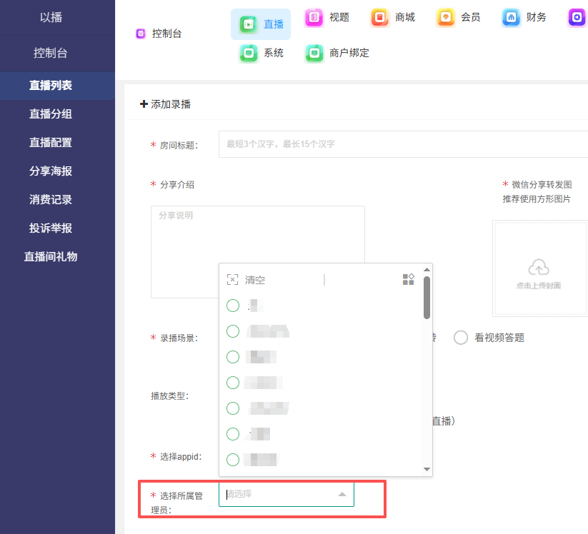 直播-直播列表-创建直播间-视频录播-创建录播 如果是用的小程序直播,并且绑定了多个小程序,此处需要选择相应的appid,以使用正确的小程序 如果需要给单独的管理员查看直播间,此处选择管理员 作者:admin 创建时间:2026-01-14 15:51最后编辑:admin 更新时间:2026-01-31 17:20