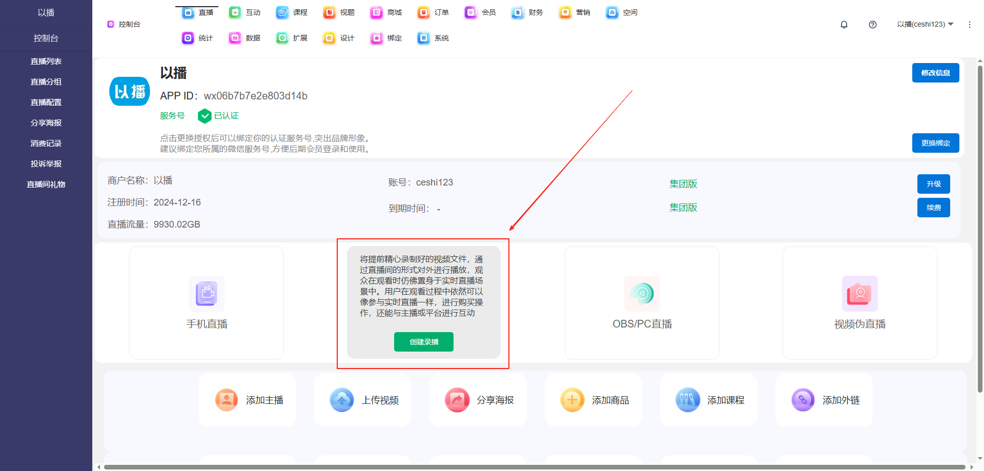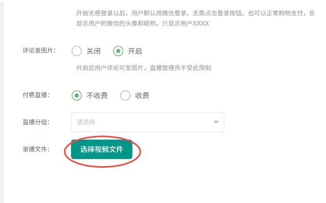 目录 搜索 展开 一、直播前的准备工作1.1.添加主播1.2.添加商品1.2.1.商品标题规范1.2.2.直播间支付解析1.2.3.添加商品分类1.2.4.pc电脑端添加商品1.2.5.手机主播端添加商品1.3.添加外链1.4.添加课程1.5.添加视频(录播/伪直播需要)1.6.添加题库(普通题库、视频题库)1.7.添加优惠券1.8.添加直播间管理员1.9.添加大转盘1.10.积分1.11.红包记录1.12.扩展投票活动1.13.设置快递1.14.添加配送方式1.15.绑定小程序1.16.绑定公众号二、创建直播间2.1.创建手机直播间2.1.1.手机创建手机直播间2.1.2.电脑创建手机直播间预告2.1.3.创建连麦直播间2.2.创建OBS/pc直播2.3.创建录播直播间2.3.1.创建答题直播间2.4.创建伪直播直播间三、给直播间添加商品或外链3.1.电脑端给直播间添加在售商品和讲解卡片3.2.主播端添加在售商品和讲解卡片3.3.给直播间添加在售外链3.4.给直播间添加在售课程四、直播间相关功能/控制4.1.直播间拉黑/禁言用户4.1.1.电脑pc端禁言4.1.2.手机端禁言4.2.直播间发红包/积分/优惠券4.2.1.主播发放优惠券/红包/积分4.2.2.pc端推送优惠券到直播间4.2.3.用户端领取4.2.4.用户发红包4.2.5.直播间发倒计时红包4.2.6.直播间管理发倒计时红包4.2.7.直播间管理员发积分4.3.直播发签到奖励:红包/积分/优惠4.4.直播间清晰度调整4.5.直播间配置调整4.6.直播间添加大转盘4.7.直播间评论区发图片4.8.直播转为伪直播4.9.直播间机器人氛围组4.9.1.添加机器人和评论组/虚拟购买4.9.2.机器人批量/随机发送评论4.9.3.导入机器人评论组4.10.直播间开启长期直播,链接不变4.11.直播间开启录制,视频可回放观看4.12.给用户下发课程链接4.13.下单课程时弹出客服二维码五、直播间更换域名5.1.后台绑定新域名5.2.服务号更换域名5.3.商户号更换域名六、分享直播间(分销)6.1.默认分销比例设置6.2.单独给商品设置分销6.3.上下级关系形成6.4.h5电脑分享直播间6.5.h5手机分享直播间6.6.微信内跳转浏览器打开直播间6.7.下载app打开直播间6.8.小程序打开直播间6.9.查看自己的推荐分享6.9.1.电脑端:有两个查看方式6.9.2.手机端,会员自己查看自己的推荐和业绩6.10.团队管理/pc端查看管理七、订单发货、售后退款7.1.订单发货、退款、状态修改7.2.商家批量发货八、门店8.1.添加门店8.2.给商品添加门店自提和快递邮寄8.3.门店邀请8.4.门店核销 暂无相关搜索结果! 阅读次数:2 本文档使用 MinDoc 发布 2.3.创建录播直播间 直播-直播列表-创建直播间-视频录播-创建录播 如果是用的小程序直播,并且绑定了多个小程序,此处需要选择相应的appid,以使用正确的小程序作者:admin 创建时间:2026-01-14 15:51最后编辑:admin 更新时间:2026-01-14 20:13