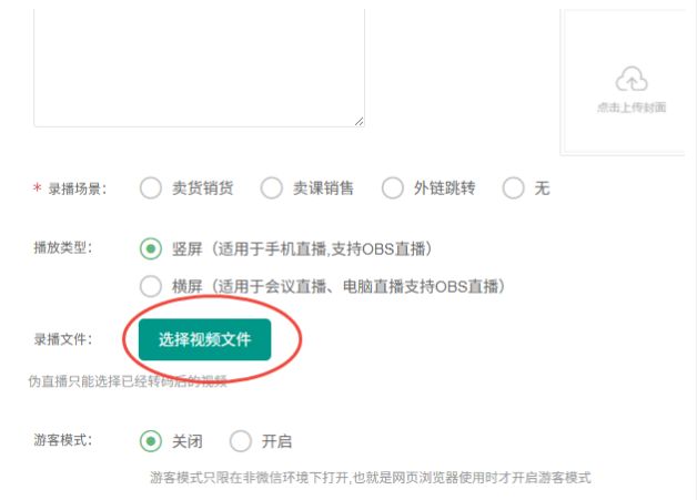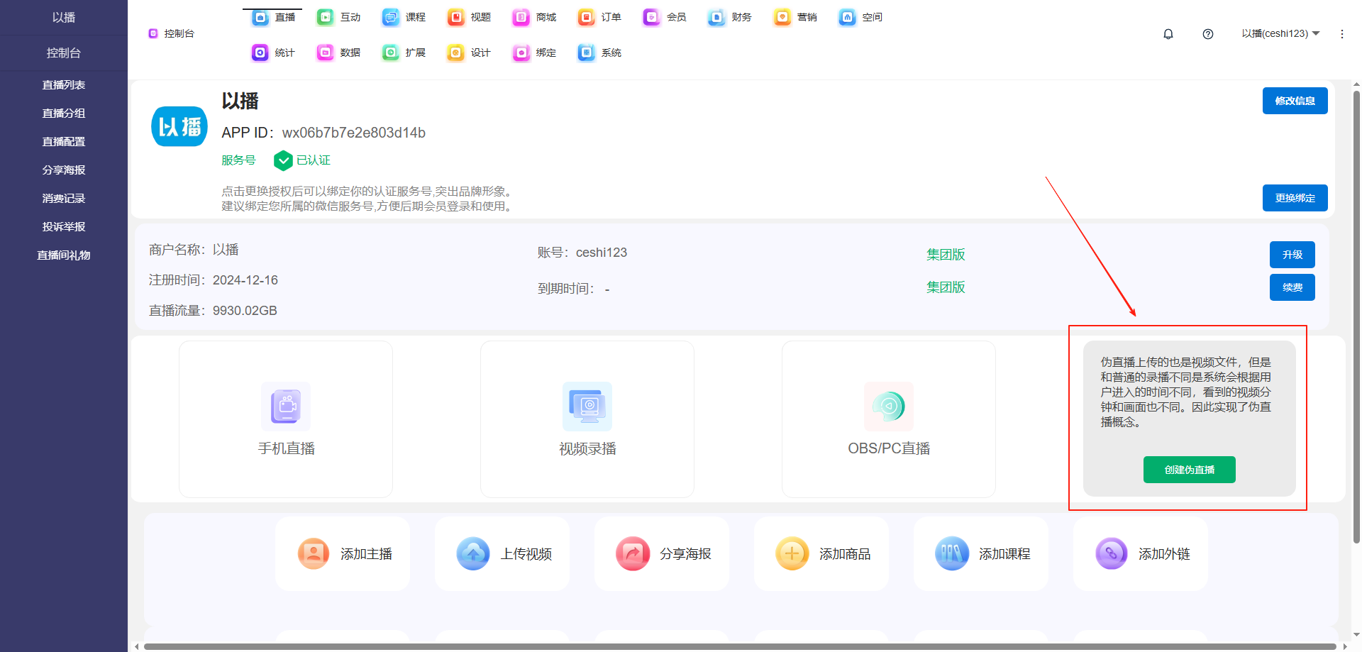 目录 搜索 展开 一、直播前的准备工作1.1.添加主播1.2.添加商品1.2.1.商品标题规范1.2.2.直播间支付解析1.2.3.添加商品分类1.2.4.pc电脑端添加商品1.2.5.手机主播端添加商品1.3.添加外链1.4.添加课程1.5.添加视频(录播/伪直播需要)1.6.添加题库(普通题库、视频题库)1.7.添加优惠券1.8.添加直播间管理员1.9.添加大转盘1.10.积分1.11.红包记录1.12.扩展投票活动1.13.设置快递1.14.添加配送方式1.15.绑定小程序1.16.绑定公众号二、创建直播间2.1.创建手机直播间2.1.1.手机创建手机直播间2.1.2.电脑创建手机直播间预告2.1.3.创建连麦直播间2.2.创建OBS/pc直播2.3.创建录播直播间2.3.1.创建答题直播间2.4.创建伪直播直播间三、给直播间添加商品或外链3.1.电脑端给直播间添加在售商品和讲解卡片3.2.主播端添加在售商品和讲解卡片3.3.给直播间添加在售外链3.4.给直播间添加在售课程四、直播间相关功能/控制4.1.直播间拉黑/禁言用户4.1.1.电脑pc端禁言4.1.2.手机端禁言4.2.直播间发红包/积分/优惠券4.2.1.主播发放优惠券/红包/积分4.2.2.pc端推送优惠券到直播间4.2.3.用户端领取4.2.4.用户发红包4.2.5.直播间发倒计时红包4.2.6.直播间管理发倒计时红包4.2.7.直播间管理员发积分4.3.直播发签到奖励:红包/积分/优惠4.4.直播间清晰度调整4.5.直播间配置调整4.6.直播间添加大转盘4.7.直播间评论区发图片4.8.直播转为伪直播4.9.直播间机器人氛围组4.9.1.添加机器人和评论组/虚拟购买4.9.2.机器人批量/随机发送评论4.9.3.导入机器人评论组4.10.直播间开启长期直播,链接不变4.11.直播间开启录制,视频可回放观看4.12.给用户下发课程链接4.13.下单课程时弹出客服二维码五、直播间更换域名5.1.后台绑定新域名5.2.服务号更换域名5.3.商户号更换域名六、分享直播间(分销)6.1.默认分销比例设置6.2.单独给商品设置分销6.3.上下级关系形成6.4.h5电脑分享直播间6.5.h5手机分享直播间6.6.微信内跳转浏览器打开直播间6.7.下载app打开直播间6.8.小程序打开直播间6.9.查看自己的推荐分享6.9.1.电脑端:有两个查看方式6.9.2.手机端,会员自己查看自己的推荐和业绩6.10.团队管理/pc端查看管理七、订单发货、售后退款7.1.订单发货、退款、状态修改7.2.商家批量发货八、门店8.1.添加门店8.2.给商品添加门店自提和快递邮寄8.3.门店邀请8.4.门店核销 暂无相关搜索结果! 阅读次数:1 本文档使用 MinDoc 发布 2.4.创建伪直播直播间 直播-直播列表-创建直播间-视频录播-创建录播 如果是用的小程序直播,并且绑定了多个小程序,此处需要选择相应的appid,以使用正确的小程序作者:admin 创建时间:2026-01-14 15:53最后编辑:admin 更新时间:2026-01-14 20:13