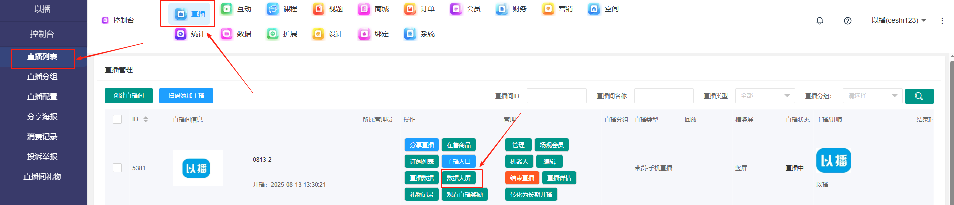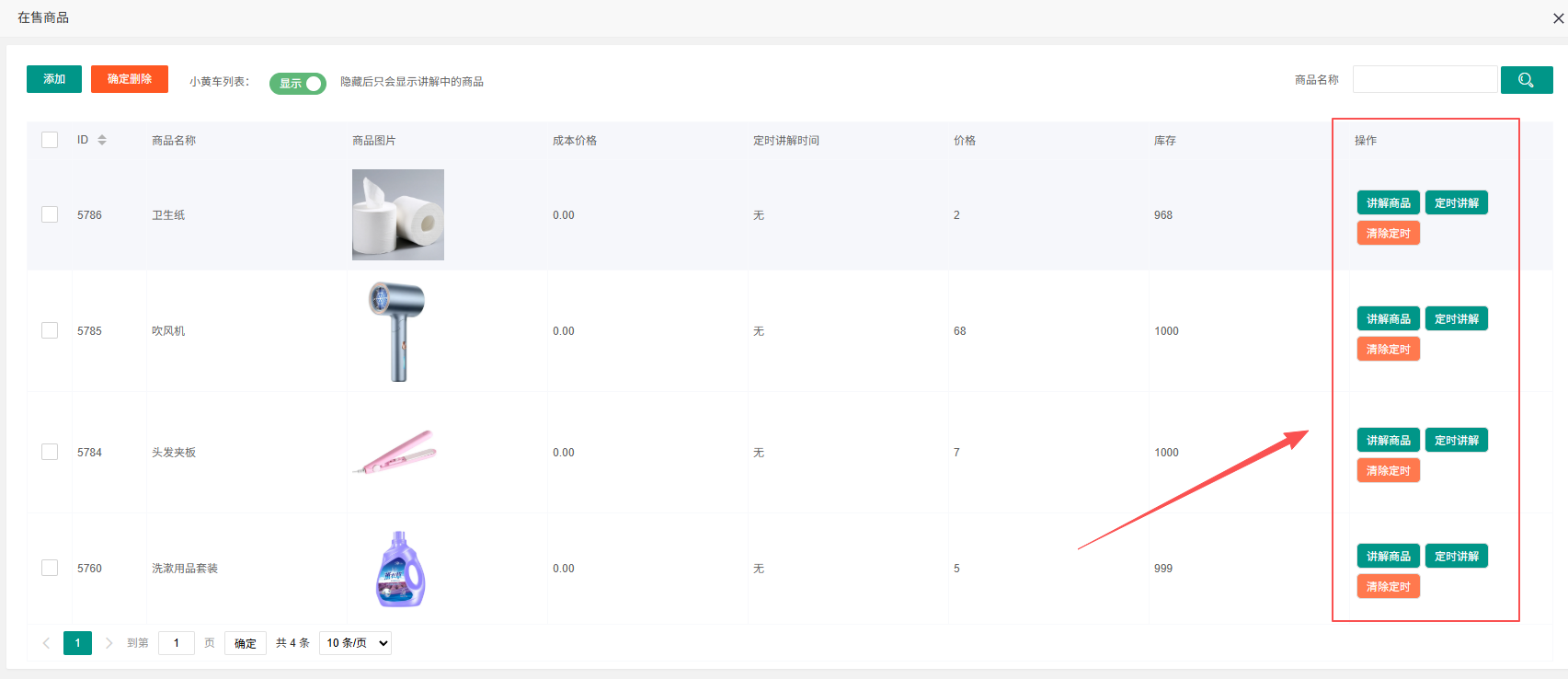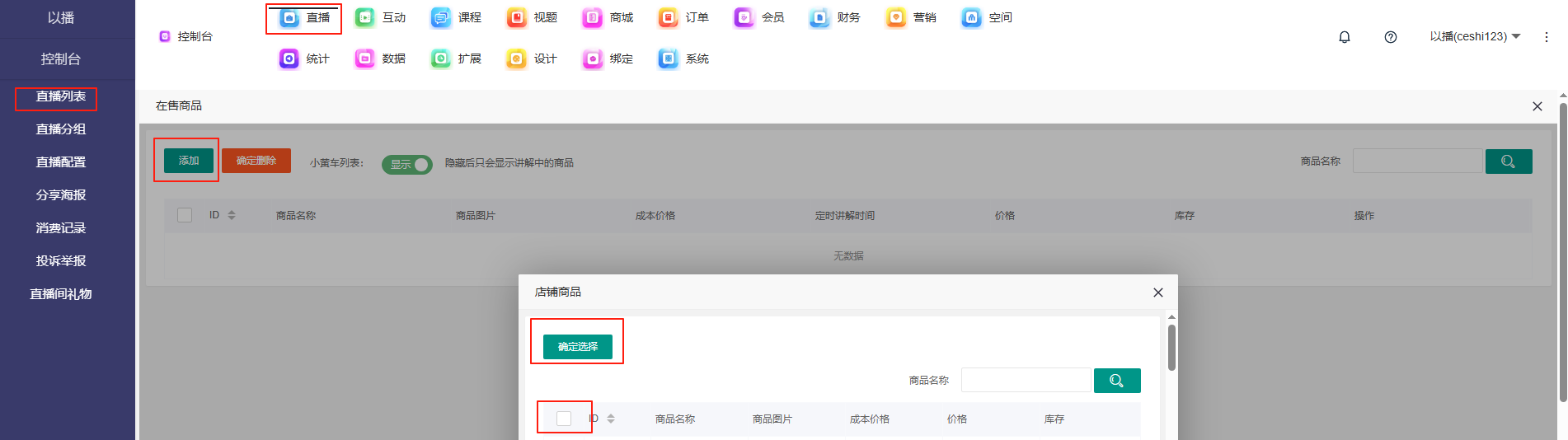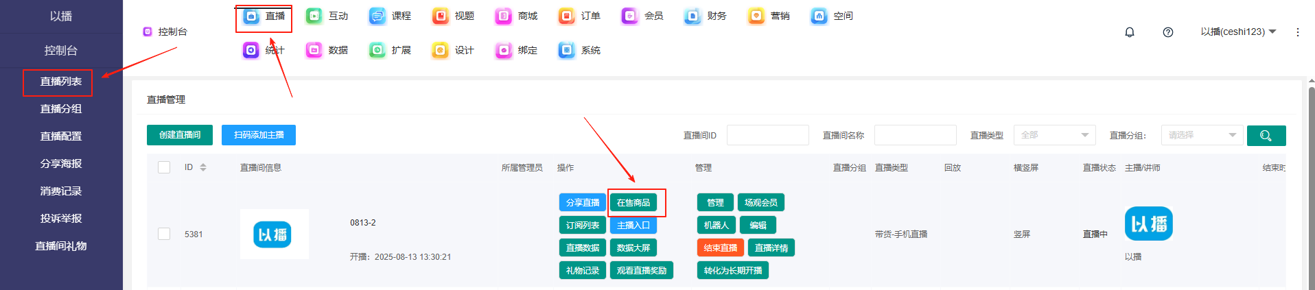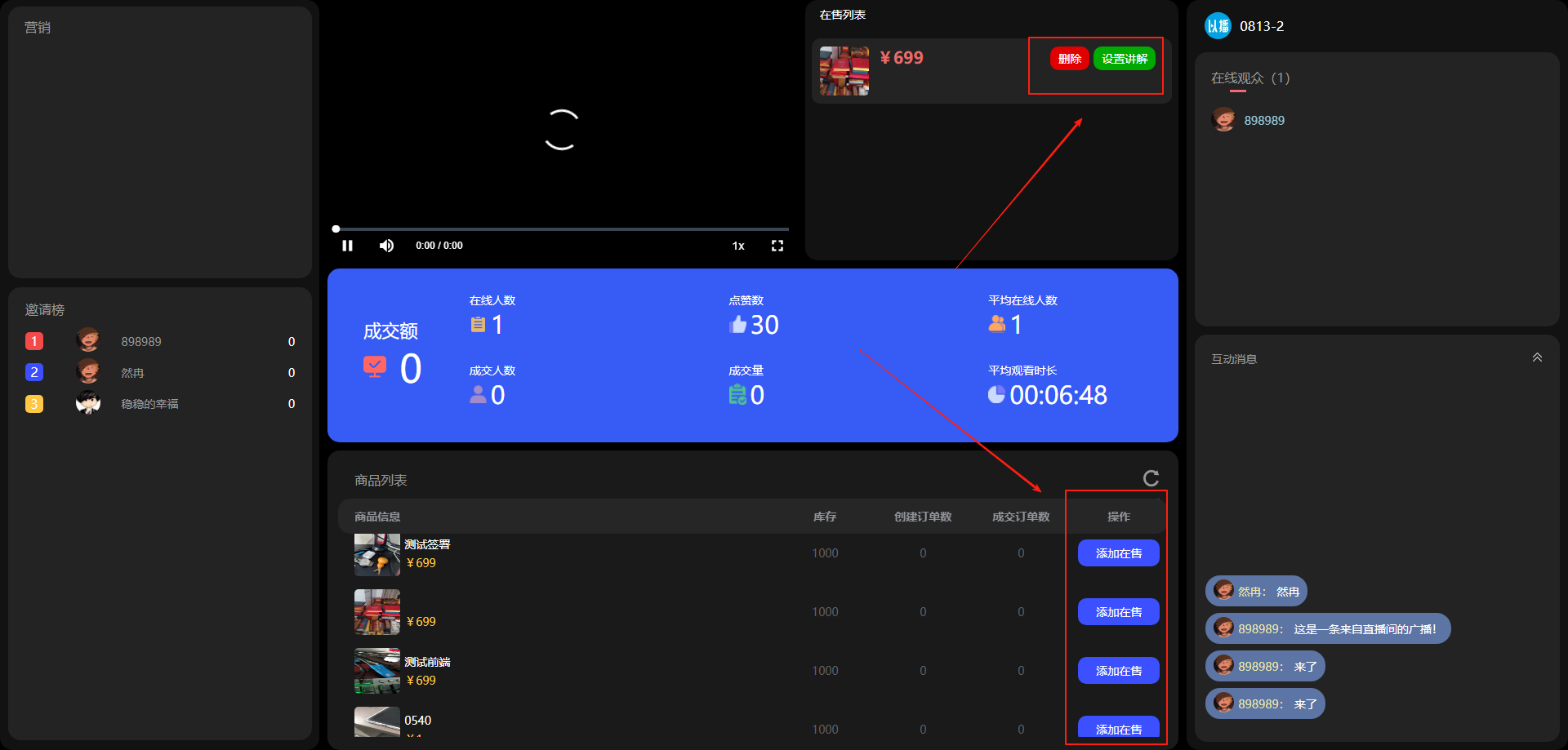 目录 搜索 展开 一、直播前的准备工作1.1.添加主播1.2.添加商品1.2.1.商品标题规范1.2.2.直播间支付解析1.2.3.添加商品分类1.2.4.pc电脑端添加商品1.2.5.手机主播端添加商品1.3.添加外链1.4.添加课程1.5.添加视频(录播/伪直播需要)1.6.添加题库(普通题库、视频题库)1.7.添加优惠券1.8.添加直播间管理员1.9.添加大转盘1.10.积分1.11.红包记录1.12.扩展投票活动1.13.设置快递1.14.添加配送方式1.15.绑定小程序1.16.绑定公众号二、创建直播间2.1.创建手机直播间2.1.1.手机创建手机直播间2.1.2.电脑创建手机直播间预告2.1.3.创建连麦直播间2.2.创建OBS/pc直播2.3.创建录播直播间2.3.1.创建答题直播间2.4.创建伪直播直播间三、给直播间添加商品或外链3.1.电脑端给直播间添加在售商品和讲解卡片3.2.主播端添加在售商品和讲解卡片3.3.给直播间添加在售外链3.4.给直播间添加在售课程四、直播间相关功能/控制4.1.直播间拉黑/禁言用户4.1.1.电脑pc端禁言4.1.2.手机端禁言4.2.直播间发红包/积分/优惠券4.2.1.主播发放优惠券/红包/积分4.2.2.pc端推送优惠券到直播间4.2.3.用户端领取4.2.4.用户发红包4.2.5.直播间发倒计时红包4.2.6.直播间管理发倒计时红包4.2.7.直播间管理员发积分4.3.直播发签到奖励:红包/积分/优惠4.4.直播间清晰度调整4.5.直播间配置调整4.6.直播间添加大转盘4.7.直播间评论区发图片4.8.直播转为伪直播4.9.直播间机器人氛围组4.9.1.添加机器人和评论组/虚拟购买4.9.2.机器人批量/随机发送评论4.9.3.导入机器人评论组4.10.直播间开启长期直播,链接不变4.11.直播间开启录制,视频可回放观看4.12.给用户下发课程链接4.13.下单课程时弹出客服二维码五、直播间更换域名5.1.后台绑定新域名5.2.服务号更换域名5.3.商户号更换域名六、分享直播间(分销)6.1.默认分销比例设置6.2.单独给商品设置分销6.3.上下级关系形成6.4.h5电脑分享直播间6.5.h5手机分享直播间6.6.微信内跳转浏览器打开直播间6.7.下载app打开直播间6.8.小程序打开直播间6.9.查看自己的推荐分享6.9.1.电脑端:有两个查看方式6.9.2.手机端,会员自己查看自己的推荐和业绩6.10.团队管理/pc端查看管理七、订单发货、售后退款7.1.订单发货、退款、状态修改7.2.商家批量发货八、门店8.1.添加门店8.2.给商品添加门店自提和快递邮寄8.3.门店邀请8.4.门店核销 暂无相关搜索结果! 阅读次数:1 本文档使用 MinDoc 发布 3.1.电脑端给直播间添加在售商品和讲解卡片 直接添加在售商品数据大屏添加在售商品作者:admin 创建时间:2026-01-14 16:27最后编辑:admin 更新时间:2026-01-14 20:13