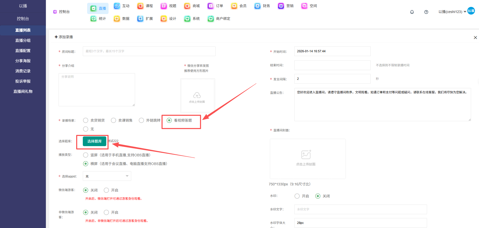 目录 搜索 展开 一、直播前的准备工作1.1.添加主播1.2.添加商品1.2.1.商品标题规范1.2.2.直播间支付解析1.2.3.添加商品分类1.2.4.pc电脑端添加商品1.2.5.手机主播端添加商品1.3.添加外链1.4.添加课程1.5.添加视频(录播/伪直播需要)1.6.添加题库(普通题库、视频题库)1.7.添加优惠券1.8.添加直播间管理员1.9.添加大转盘1.10.积分1.11.红包记录1.12.扩展投票活动1.13.设置快递1.14.添加配送方式1.15.绑定小程序1.16.绑定公众号二、创建直播间2.1.创建手机直播间2.1.1.手机创建手机直播间2.1.2.电脑创建手机直播间预告2.1.3.创建连麦直播间2.2.创建OBS/pc直播2.3.创建录播直播间2.3.1.创建答题直播间2.4.创建伪直播直播间三、给直播间添加商品或外链3.1.电脑端给直播间添加在售商品和讲解卡片3.2.主播端添加在售商品和讲解卡片3.3.给直播间添加在售外链3.4.给直播间添加在售课程四、直播间相关功能/控制4.1.直播间拉黑/禁言用户4.1.1.电脑pc端禁言4.1.2.手机端禁言4.2.直播间发红包/积分/优惠券4.2.1.主播发放优惠券/红包/积分4.2.2.pc端推送优惠券到直播间4.2.3.用户端领取4.2.4.用户发红包4.2.5.直播间发倒计时红包4.2.6.直播间管理发倒计时红包4.2.7.直播间管理员发积分4.3.直播发签到奖励:红包/积分/优惠4.4.直播间清晰度调整4.5.直播间配置调整4.6.直播间添加大转盘4.7.直播间评论区发图片4.8.直播转为伪直播4.9.直播间机器人氛围组4.9.1.添加机器人和评论组/虚拟购买4.9.2.机器人批量/随机发送评论4.9.3.导入机器人评论组4.10.直播间开启长期直播,链接不变4.11.直播间开启录制,视频可回放观看4.12.给用户下发课程链接4.13.下单课程时弹出客服二维码五、直播间更换域名5.1.后台绑定新域名5.2.服务号更换域名5.3.商户号更换域名六、分享直播间(分销)6.1.默认分销比例设置6.2.单独给商品设置分销6.3.上下级关系形成6.4.h5电脑分享直播间6.5.h5手机分享直播间6.6.微信内跳转浏览器打开直播间6.7.下载app打开直播间6.8.小程序打开直播间6.9.查看自己的推荐分享6.9.1.电脑端:有两个查看方式6.9.2.手机端,会员自己查看自己的推荐和业绩6.10.团队管理/pc端查看管理七、订单发货、售后退款7.1.订单发货、退款、状态修改7.2.商家批量发货八、门店8.1.添加门店8.2.给商品添加门店自提和快递邮寄8.3.门店邀请8.4.门店核销 暂无相关搜索结果! 阅读次数:1 本文档使用 MinDoc 发布 2.3.1.创建答题直播间 创建录播直播间,选择看视频答题作者:admin 创建时间:2026-01-14 16:58最后编辑:admin 更新时间:2026-01-14 20:13