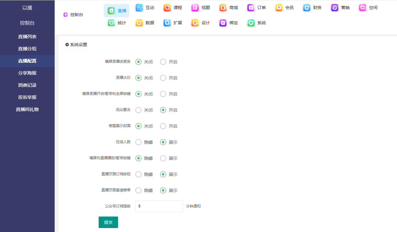 在直播中找到直播配置,点击后您在系统配置就可以调整您的直播配置,可以调整如下功能录播进度条/录播水印/微信浏览器手机号绑定/非微信浏览器手机号登录/观众匿名/答题展示封面/在线人数/公众号订阅提前作者:admin 创建时间:2026-01-14 17:15最后编辑:admin 更新时间:2026-01-14 20:13
