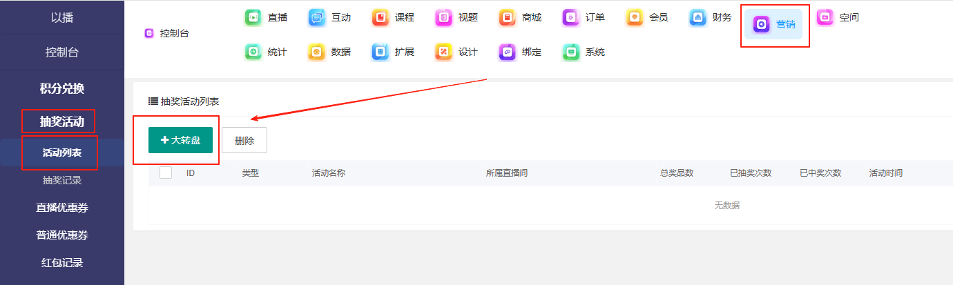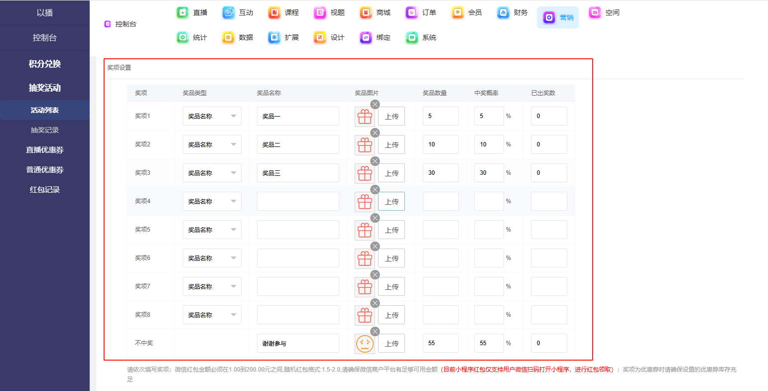 目录 搜索 展开 一、直播前的准备工作1.1.添加主播1.2.添加商品1.2.1.商品标题规范1.2.2.直播间支付解析1.2.3.添加商品分类1.2.4.pc电脑端添加商品1.2.5.手机主播端添加商品1.3.添加外链1.4.添加课程1.5.添加视频(录播/伪直播需要)1.6.添加题库(普通题库、视频题库)1.7.添加优惠券1.8.添加直播间管理员1.9.添加大转盘1.10.积分1.11.红包记录1.12.扩展投票活动1.13.设置快递1.14.添加配送方式1.15.绑定小程序1.16.绑定公众号二、创建直播间2.1.创建手机直播间2.1.1.手机创建手机直播间2.1.2.电脑创建手机直播间预告2.1.3.创建连麦直播间2.2.创建OBS/pc直播2.3.创建录播直播间2.3.1.创建答题直播间2.4.创建伪直播直播间三、给直播间添加商品或外链3.1.电脑端给直播间添加在售商品和讲解卡片3.2.主播端添加在售商品和讲解卡片3.3.给直播间添加在售外链3.4.给直播间添加在售课程四、直播间相关功能/控制4.1.直播间拉黑/禁言用户4.1.1.电脑pc端禁言4.1.2.手机端禁言4.2.直播间发红包/积分/优惠券4.2.1.主播发放优惠券/红包/积分4.2.2.pc端推送优惠券到直播间4.2.3.用户端领取4.2.4.用户发红包4.2.5.直播间发倒计时红包4.2.6.直播间管理发倒计时红包4.2.7.直播间管理员发积分4.3.直播发签到奖励:红包/积分/优惠4.4.直播间清晰度调整4.5.直播间配置调整4.6.直播间添加大转盘4.7.直播间评论区发图片4.8.直播转为伪直播4.9.直播间机器人氛围组4.9.1.添加机器人和评论组/虚拟购买4.9.2.机器人批量/随机发送评论4.9.3.导入机器人评论组4.10.直播间开启长期直播,链接不变4.11.直播间开启录制,视频可回放观看4.12.给用户下发课程链接4.13.下单课程时弹出客服二维码五、直播间更换域名5.1.后台绑定新域名5.2.服务号更换域名5.3.商户号更换域名六、分享直播间(分销)6.1.默认分销比例设置6.2.单独给商品设置分销6.3.上下级关系形成6.4.h5电脑分享直播间6.5.h5手机分享直播间6.6.微信内跳转浏览器打开直播间6.7.下载app打开直播间6.8.小程序打开直播间6.9.查看自己的推荐分享6.9.1.电脑端:有两个查看方式6.9.2.手机端,会员自己查看自己的推荐和业绩6.10.团队管理/pc端查看管理七、订单发货、售后退款7.1.订单发货、退款、状态修改7.2.商家批量发货八、门店8.1.添加门店8.2.给商品添加门店自提和快递邮寄8.3.门店邀请8.4.门店核销 暂无相关搜索结果! 阅读次数:1 本文档使用 MinDoc 发布 1.9.添加大转盘 作者:admin 创建时间:2026-01-14 17:16最后编辑:admin 更新时间:2026-01-14 20:13
