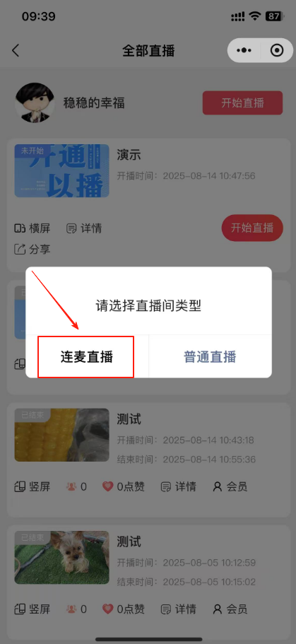 目录 搜索 展开 一、直播前的准备工作1.1.添加主播1.2.添加商品1.2.1.商品标题规范1.2.2.直播间支付解析1.2.3.添加商品分类1.2.4.pc电脑端添加商品1.2.5.手机主播端添加商品1.3.添加外链1.4.添加课程1.5.添加视频(录播/伪直播需要)1.6.添加题库(普通题库、视频题库)1.7.添加优惠券1.8.添加直播间管理员1.9.添加大转盘1.10.积分1.11.红包记录1.12.扩展投票活动1.13.设置快递1.14.添加配送方式1.15.绑定小程序1.16.绑定公众号二、创建直播间2.1.创建手机直播间2.1.1.手机创建手机直播间2.1.2.电脑创建手机直播间预告2.1.3.创建连麦直播间2.2.创建OBS/pc直播2.3.创建录播直播间2.3.1.创建答题直播间2.4.创建伪直播直播间三、给直播间添加商品或外链3.1.电脑端给直播间添加在售商品和讲解卡片3.2.主播端添加在售商品和讲解卡片3.3.给直播间添加在售外链3.4.给直播间添加在售课程四、直播间相关功能/控制4.1.直播间拉黑/禁言用户4.1.1.电脑pc端禁言4.1.2.手机端禁言4.2.直播间发红包/积分/优惠券4.2.1.主播发放优惠券/红包/积分4.2.2.pc端推送优惠券到直播间4.2.3.用户端领取4.2.4.用户发红包4.2.5.直播间发倒计时红包4.2.6.直播间管理发倒计时红包4.2.7.直播间管理员发积分4.3.直播发签到奖励:红包/积分/优惠4.4.直播间清晰度调整4.5.直播间配置调整4.6.直播间添加大转盘4.7.直播间评论区发图片4.8.直播转为伪直播4.9.直播间机器人氛围组4.9.1.添加机器人和评论组/虚拟购买4.9.2.机器人批量/随机发送评论4.9.3.导入机器人评论组4.10.直播间开启长期直播,链接不变4.11.直播间开启录制,视频可回放观看4.12.给用户下发课程链接4.13.下单课程时弹出客服二维码五、直播间更换域名5.1.后台绑定新域名5.2.服务号更换域名5.3.商户号更换域名六、分享直播间(分销)6.1.默认分销比例设置6.2.单独给商品设置分销6.3.上下级关系形成6.4.h5电脑分享直播间6.5.h5手机分享直播间6.6.微信内跳转浏览器打开直播间6.7.下载app打开直播间6.8.小程序打开直播间6.9.查看自己的推荐分享6.9.1.电脑端:有两个查看方式6.9.2.手机端,会员自己查看自己的推荐和业绩6.10.团队管理/pc端查看管理七、订单发货、售后退款7.1.订单发货、退款、状态修改7.2.商家批量发货八、门店8.1.添加门店8.2.给商品添加门店自提和快递邮寄8.3.门店邀请8.4.门店核销 暂无相关搜索结果! 阅读次数:1 本文档使用 MinDoc 发布 2.1.3.创建连麦直播间 手机创建手机直播间,选择连麦直播作者:admin 创建时间:2026-01-14 17:26最后编辑:admin 更新时间:2026-01-14 20:13