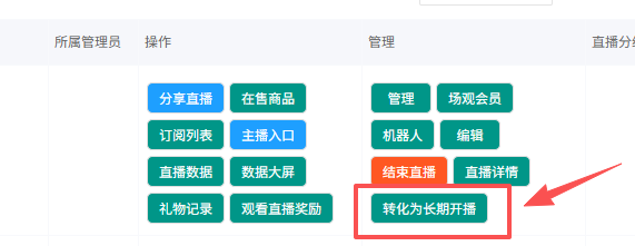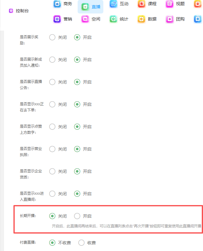 目录 搜索 展开 一、直播前的准备工作1.1.添加主播1.2.添加商品1.2.1.商品标题规范1.2.2.直播间支付解析1.2.3.添加商品分类1.2.4.pc电脑端添加商品1.2.5.手机主播端添加商品1.3.添加外链1.4.添加课程1.5.添加视频(录播/伪直播需要)1.6.添加题库(普通题库、视频题库)1.7.添加优惠券1.8.添加直播间管理员1.9.添加大转盘1.10.积分1.11.红包记录1.12.扩展投票活动1.13.设置快递1.14.添加配送方式1.15.绑定小程序1.16.绑定公众号二、创建直播间2.1.创建手机直播间2.1.1.手机创建手机直播间2.1.2.电脑创建手机直播间预告2.1.3.创建连麦直播间2.2.创建OBS/pc直播2.3.创建录播直播间2.3.1.创建答题直播间2.4.创建伪直播直播间三、给直播间添加商品或外链3.1.电脑端给直播间添加在售商品和讲解卡片3.2.主播端添加在售商品和讲解卡片3.3.给直播间添加在售外链3.4.给直播间添加在售课程四、直播间相关功能/控制4.1.直播间拉黑/禁言用户4.1.1.电脑pc端禁言4.1.2.手机端禁言4.2.直播间发红包/积分/优惠券4.2.1.主播发放优惠券/红包/积分4.2.2.pc端推送优惠券到直播间4.2.3.用户端领取4.2.4.用户发红包4.2.5.直播间发倒计时红包4.2.6.直播间管理发倒计时红包4.2.7.直播间管理员发积分4.3.直播发签到奖励:红包/积分/优惠4.4.直播间清晰度调整4.5.直播间配置调整4.6.直播间添加大转盘4.7.直播间评论区发图片4.8.直播转为伪直播4.9.直播间机器人氛围组4.9.1.添加机器人和评论组/虚拟购买4.9.2.机器人批量/随机发送评论4.9.3.导入机器人评论组4.10.直播间开启长期直播,链接不变4.11.直播间开启录制,视频可回放观看4.12.给用户下发课程链接4.13.下单课程时弹出客服二维码五、直播间更换域名5.1.后台绑定新域名5.2.服务号更换域名5.3.商户号更换域名六、分享直播间(分销)6.1.默认分销比例设置6.2.单独给商品设置分销6.3.上下级关系形成6.4.h5电脑分享直播间6.5.h5手机分享直播间6.6.微信内跳转浏览器打开直播间6.7.下载app打开直播间6.8.小程序打开直播间6.9.查看自己的推荐分享6.9.1.电脑端:有两个查看方式6.9.2.手机端,会员自己查看自己的推荐和业绩6.10.团队管理/pc端查看管理七、订单发货、售后退款7.1.订单发货、退款、状态修改7.2.商家批量发货八、门店8.1.添加门店8.2.给商品添加门店自提和快递邮寄8.3.门店邀请8.4.门店核销 暂无相关搜索结果! 阅读次数:1 本文档使用 MinDoc 发布 4.10.直播间开启长期直播,链接不变 直播-直播列表-创建直播间-长期开播-开启 直播-直播列表-转化为长期开播 作者:admin 创建时间:2026-01-14 18:13最后编辑:admin 更新时间:2026-01-14 20:13