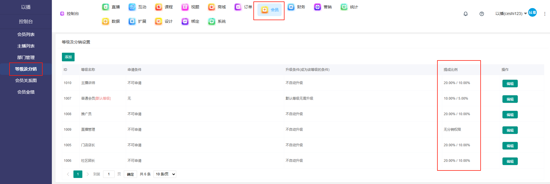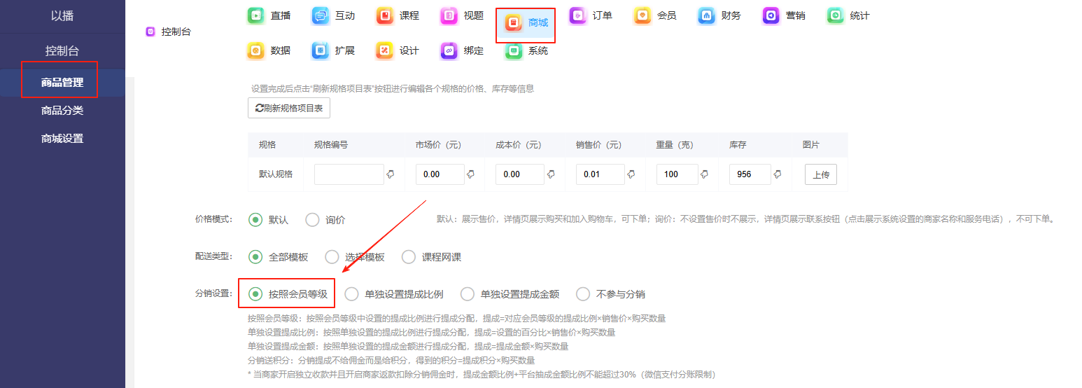 目录 搜索 展开 一、直播前的准备工作1.1.添加主播1.2.添加商品1.2.1.商品标题规范1.2.2.直播间支付解析1.2.3.添加商品分类1.2.4.pc电脑端添加商品1.2.5.手机主播端添加商品1.3.添加外链1.4.添加课程1.5.添加视频(录播/伪直播需要)1.6.添加题库(普通题库、视频题库)1.7.添加优惠券1.8.添加直播间管理员1.9.添加大转盘1.10.积分1.11.红包记录1.12.扩展投票活动1.13.设置快递1.14.添加配送方式1.15.绑定小程序1.16.绑定公众号二、创建直播间2.1.创建手机直播间2.1.1.手机创建手机直播间2.1.2.电脑创建手机直播间预告2.1.3.创建连麦直播间2.2.创建OBS/pc直播2.3.创建录播直播间2.3.1.创建答题直播间2.4.创建伪直播直播间三、给直播间添加商品或外链3.1.电脑端给直播间添加在售商品和讲解卡片3.2.主播端添加在售商品和讲解卡片3.3.给直播间添加在售外链3.4.给直播间添加在售课程四、直播间相关功能/控制4.1.直播间拉黑/禁言用户4.1.1.电脑pc端禁言4.1.2.手机端禁言4.2.直播间发红包/积分/优惠券4.2.1.主播发放优惠券/红包/积分4.2.2.pc端推送优惠券到直播间4.2.3.用户端领取4.2.4.用户发红包4.2.5.直播间发倒计时红包4.2.6.直播间管理发倒计时红包4.2.7.直播间管理员发积分4.3.直播发签到奖励:红包/积分/优惠4.4.直播间清晰度调整4.5.直播间配置调整4.6.直播间添加大转盘4.7.直播间评论区发图片4.8.直播转为伪直播4.9.直播间机器人氛围组4.9.1.添加机器人和评论组/虚拟购买4.9.2.机器人批量/随机发送评论4.9.3.导入机器人评论组4.10.直播间开启长期直播,链接不变4.11.直播间开启录制,视频可回放观看4.12.给用户下发课程链接4.13.下单课程时弹出客服二维码五、直播间更换域名5.1.后台绑定新域名5.2.服务号更换域名5.3.商户号更换域名六、分享直播间(分销)6.1.默认分销比例设置6.2.单独给商品设置分销6.3.上下级关系形成6.4.h5电脑分享直播间6.5.h5手机分享直播间6.6.微信内跳转浏览器打开直播间6.7.下载app打开直播间6.8.小程序打开直播间6.9.查看自己的推荐分享6.9.1.电脑端:有两个查看方式6.9.2.手机端,会员自己查看自己的推荐和业绩6.10.团队管理/pc端查看管理七、订单发货、售后退款7.1.订单发货、退款、状态修改7.2.商家批量发货八、门店8.1.添加门店8.2.给商品添加门店自提和快递邮寄8.3.门店邀请8.4.门店核销 暂无相关搜索结果! 阅读次数:1 本文档使用 MinDoc 发布 6.1.默认分销比例设置 作者:admin 创建时间:2026-01-14 18:22最后编辑:admin 更新时间:2026-01-14 20:13