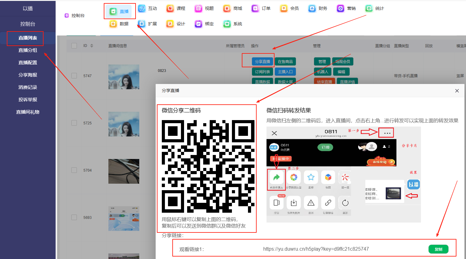 目录 搜索 展开 一、直播前的准备工作1.1.添加主播1.2.添加商品1.2.1.商品标题规范1.2.2.直播间支付解析1.2.3.添加商品分类1.2.4.pc电脑端添加商品1.2.5.手机主播端添加商品1.3.添加外链1.4.添加课程1.5.添加视频(录播/伪直播需要)1.6.添加题库(普通题库、视频题库)1.7.添加优惠券1.8.添加直播间管理员1.9.添加大转盘1.10.积分1.11.红包记录1.12.扩展投票活动1.13.设置快递1.14.添加配送方式1.15.绑定小程序1.16.绑定公众号二、创建直播间2.1.创建手机直播间2.1.1.手机创建手机直播间2.1.2.电脑创建手机直播间预告2.1.3.创建连麦直播间2.2.创建OBS/pc直播2.3.创建录播直播间2.3.1.创建答题直播间2.4.创建伪直播直播间三、给直播间添加商品或外链3.1.电脑端给直播间添加在售商品和讲解卡片3.2.主播端添加在售商品和讲解卡片3.3.给直播间添加在售外链3.4.给直播间添加在售课程四、直播间相关功能/控制4.1.直播间拉黑/禁言用户4.1.1.电脑pc端禁言4.1.2.手机端禁言4.2.直播间发红包/积分/优惠券4.2.1.主播发放优惠券/红包/积分4.2.2.pc端推送优惠券到直播间4.2.3.用户端领取4.2.4.用户发红包4.2.5.直播间发倒计时红包4.2.6.直播间管理发倒计时红包4.2.7.直播间管理员发积分4.3.直播发签到奖励:红包/积分/优惠4.4.直播间清晰度调整4.5.直播间配置调整4.6.直播间添加大转盘4.7.直播间评论区发图片4.8.直播转为伪直播4.9.直播间机器人氛围组4.9.1.添加机器人和评论组/虚拟购买4.9.2.机器人批量/随机发送评论4.9.3.导入机器人评论组4.10.直播间开启长期直播,链接不变4.11.直播间开启录制,视频可回放观看4.12.给用户下发课程链接4.13.下单课程时弹出客服二维码五、直播间更换域名5.1.后台绑定新域名5.2.服务号更换域名5.3.商户号更换域名六、分享直播间(分销)6.1.默认分销比例设置6.2.单独给商品设置分销6.3.上下级关系形成6.4.h5电脑分享直播间6.5.h5手机分享直播间6.6.微信内跳转浏览器打开直播间6.7.下载app打开直播间6.8.小程序打开直播间6.9.查看自己的推荐分享6.9.1.电脑端:有两个查看方式6.9.2.手机端,会员自己查看自己的推荐和业绩6.10.团队管理/pc端查看管理七、订单发货、售后退款7.1.订单发货、退款、状态修改7.2.商家批量发货八、门店8.1.添加门店8.2.给商品添加门店自提和快递邮寄8.3.门店邀请8.4.门店核销 暂无相关搜索结果! 阅读次数:1 本文档使用 MinDoc 发布 6.4.h5电脑分享直播间 作者:admin 创建时间:2026-01-14 18:23最后编辑:admin 更新时间:2026-01-14 20:13
