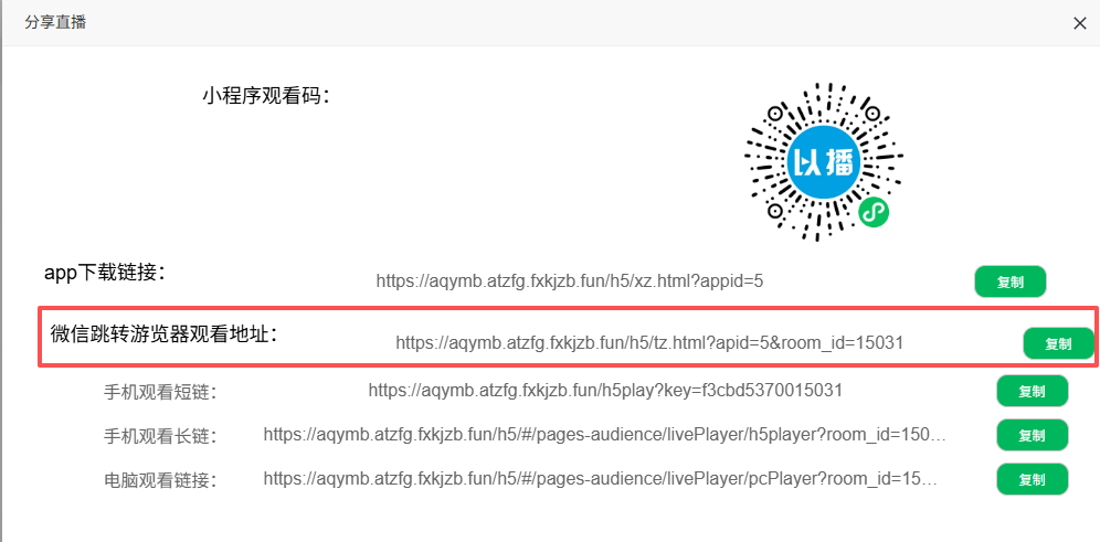 目录 搜索 展开 一、直播前的准备工作1.1.添加主播1.2.添加商品1.2.1.商品标题规范1.2.2.直播间支付解析1.2.3.添加商品分类1.2.4.pc电脑端添加商品1.2.5.手机主播端添加商品1.3.添加外链1.4.添加课程1.5.添加视频(录播/伪直播需要)1.6.添加题库(普通题库、视频题库)1.7.添加优惠券1.8.添加直播间管理员1.9.添加大转盘1.10.积分1.11.红包记录1.12.扩展投票活动1.13.设置快递1.14.添加配送方式1.15.绑定小程序1.16.绑定公众号二、创建直播间2.1.创建手机直播间2.1.1.手机创建手机直播间2.1.2.电脑创建手机直播间预告2.1.3.创建连麦直播间2.2.创建OBS/pc直播2.3.创建录播直播间2.3.1.创建答题直播间2.4.创建伪直播直播间三、给直播间添加商品或外链3.1.电脑端给直播间添加在售商品和讲解卡片3.2.主播端添加在售商品和讲解卡片3.3.给直播间添加在售外链3.4.给直播间添加在售课程四、直播间相关功能/控制4.1.直播间拉黑/禁言用户4.1.1.电脑pc端禁言4.1.2.手机端禁言4.2.直播间发红包/积分/优惠券4.2.1.主播发放优惠券/红包/积分4.2.2.pc端推送优惠券到直播间4.2.3.用户端领取4.2.4.用户发红包4.2.5.直播间发倒计时红包4.2.6.直播间管理发倒计时红包4.2.7.直播间管理员发积分4.3.直播发签到奖励:红包/积分/优惠4.4.直播间清晰度调整4.5.直播间配置调整4.6.直播间添加大转盘4.7.直播间评论区发图片4.8.直播转为伪直播4.9.直播间机器人氛围组4.9.1.添加机器人和评论组/虚拟购买4.9.2.机器人批量/随机发送评论4.9.3.导入机器人评论组4.10.直播间开启长期直播,链接不变4.11.直播间开启录制,视频可回放观看4.12.给用户下发课程链接4.13.下单课程时弹出客服二维码五、直播间更换域名5.1.后台绑定新域名5.2.服务号更换域名5.3.商户号更换域名六、分享直播间(分销)6.1.默认分销比例设置6.2.单独给商品设置分销6.3.上下级关系形成6.4.h5电脑分享直播间6.5.h5手机分享直播间6.6.微信内跳转浏览器打开直播间6.7.下载app打开直播间6.8.小程序打开直播间6.9.查看自己的推荐分享6.9.1.电脑端:有两个查看方式6.9.2.手机端,会员自己查看自己的推荐和业绩6.10.团队管理/pc端查看管理七、订单发货、售后退款7.1.订单发货、退款、状态修改7.2.商家批量发货八、门店8.1.添加门店8.2.给商品添加门店自提和快递邮寄8.3.门店邀请8.4.门店核销 暂无相关搜索结果! 阅读次数:1 本文档使用 MinDoc 发布 6.6.微信内跳转浏览器打开直播间 作者:admin 创建时间:2026-01-14 18:26最后编辑:admin 更新时间:2026-01-14 20:13