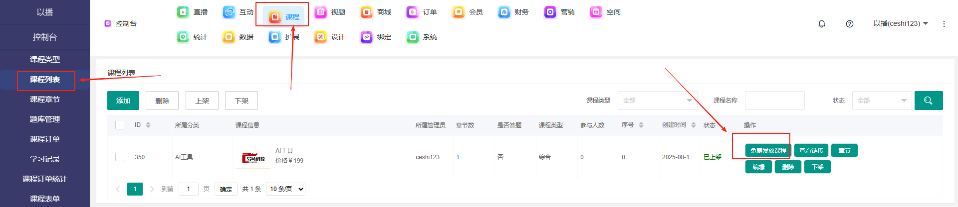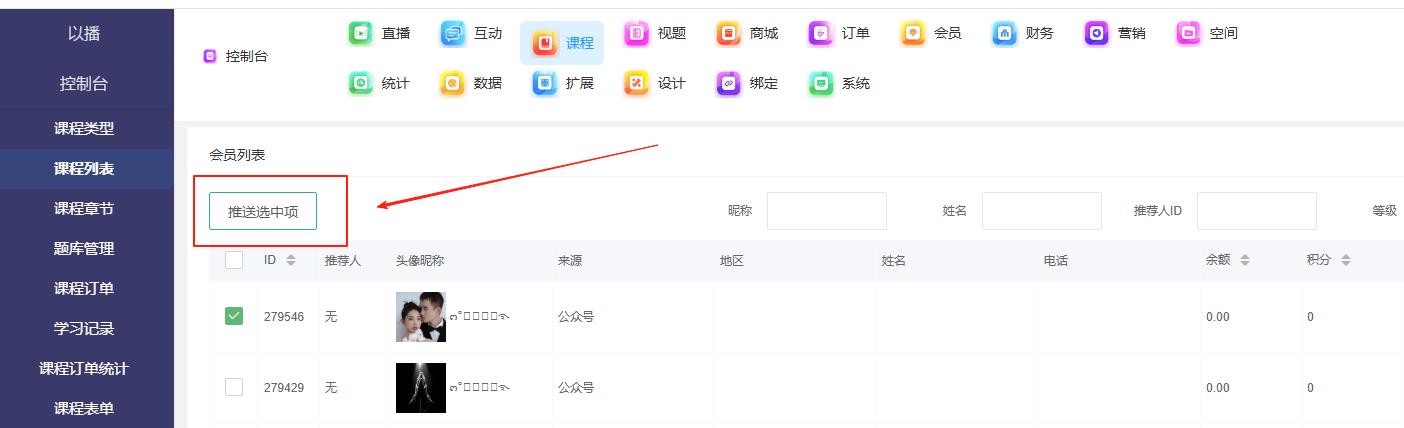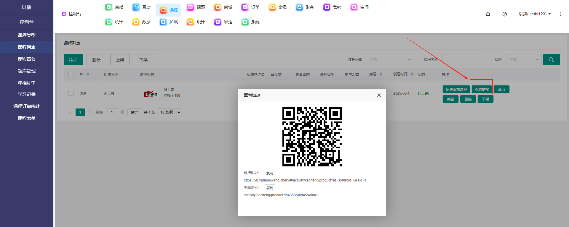 目录 搜索 展开 一、直播前的准备工作1.1.添加主播1.2.添加商品1.2.1.商品标题规范1.2.2.直播间支付解析1.2.3.添加商品分类1.2.4.pc电脑端添加商品1.2.5.手机主播端添加商品1.3.添加外链1.4.添加课程1.5.添加视频(录播/伪直播需要)1.6.添加题库(普通题库、视频题库)1.7.添加优惠券1.8.添加直播间管理员1.9.添加大转盘1.10.积分1.11.红包记录1.12.扩展投票活动1.13.设置快递1.14.添加配送方式1.15.绑定小程序1.16.绑定公众号二、创建直播间2.1.创建手机直播间2.1.1.手机创建手机直播间2.1.2.电脑创建手机直播间预告2.1.3.创建连麦直播间2.2.创建OBS/pc直播2.3.创建录播直播间2.3.1.创建答题直播间2.4.创建伪直播直播间三、给直播间添加商品或外链3.1.电脑端给直播间添加在售商品和讲解卡片3.2.主播端添加在售商品和讲解卡片3.3.给直播间添加在售外链3.4.给直播间添加在售课程四、直播间相关功能/控制4.1.直播间拉黑/禁言用户4.1.1.电脑pc端禁言4.1.2.手机端禁言4.2.直播间发红包/积分/优惠券4.2.1.主播发放优惠券/红包/积分4.2.2.pc端推送优惠券到直播间4.2.3.用户端领取4.2.4.用户发红包4.2.5.直播间发倒计时红包4.2.6.直播间管理发倒计时红包4.2.7.直播间管理员发积分4.3.直播发签到奖励:红包/积分/优惠4.4.直播间清晰度调整4.5.直播间配置调整4.6.直播间添加大转盘4.7.直播间评论区发图片4.8.直播转为伪直播4.9.直播间机器人氛围组4.9.1.添加机器人和评论组/虚拟购买4.9.2.机器人批量/随机发送评论4.9.3.导入机器人评论组4.10.直播间开启长期直播,链接不变4.11.直播间开启录制,视频可回放观看4.12.给用户下发课程链接4.13.下单课程时弹出客服二维码五、直播间更换域名5.1.后台绑定新域名5.2.服务号更换域名5.3.商户号更换域名六、分享直播间(分销)6.1.默认分销比例设置6.2.单独给商品设置分销6.3.上下级关系形成6.4.h5电脑分享直播间6.5.h5手机分享直播间6.6.微信内跳转浏览器打开直播间6.7.下载app打开直播间6.8.小程序打开直播间6.9.查看自己的推荐分享6.9.1.电脑端:有两个查看方式6.9.2.手机端,会员自己查看自己的推荐和业绩6.10.团队管理/pc端查看管理七、订单发货、售后退款7.1.订单发货、退款、状态修改7.2.商家批量发货八、门店8.1.添加门店8.2.给商品添加门店自提和快递邮寄8.3.门店邀请8.4.门店核销 暂无相关搜索结果! 阅读次数:1 本文档使用 MinDoc 发布 4.12.给用户下发课程链接 发放之后扫码或者链接就可以看了,不发放的话需要购买才能看作者:admin 创建时间:2026-01-14 18:40最后编辑:admin 更新时间:2026-01-14 20:13