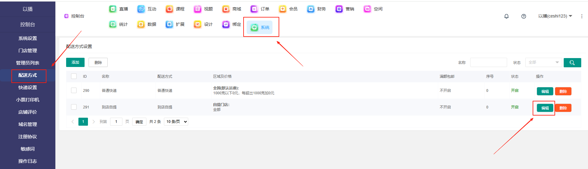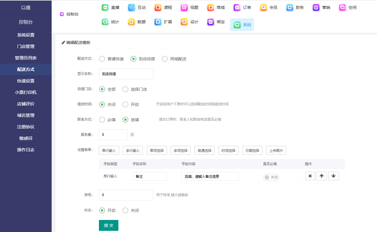 目录 搜索 展开 一、直播前的准备工作1.1.添加主播1.2.添加商品1.2.1.商品标题规范1.2.2.直播间支付解析1.2.3.添加商品分类1.2.4.pc电脑端添加商品1.2.5.手机主播端添加商品1.3.添加外链1.4.添加课程1.5.添加视频(录播/伪直播需要)1.6.添加题库(普通题库、视频题库)1.7.添加优惠券1.8.添加直播间管理员1.9.添加大转盘1.10.积分1.11.红包记录1.12.扩展投票活动1.13.设置快递1.14.添加配送方式1.15.绑定小程序1.16.绑定公众号二、创建直播间2.1.创建手机直播间2.1.1.手机创建手机直播间2.1.2.电脑创建手机直播间预告2.1.3.创建连麦直播间2.2.创建OBS/pc直播2.3.创建录播直播间2.3.1.创建答题直播间2.4.创建伪直播直播间三、给直播间添加商品或外链3.1.电脑端给直播间添加在售商品和讲解卡片3.2.主播端添加在售商品和讲解卡片3.3.给直播间添加在售外链3.4.给直播间添加在售课程四、直播间相关功能/控制4.1.直播间拉黑/禁言用户4.1.1.电脑pc端禁言4.1.2.手机端禁言4.2.直播间发红包/积分/优惠券4.2.1.主播发放优惠券/红包/积分4.2.2.pc端推送优惠券到直播间4.2.3.用户端领取4.2.4.用户发红包4.2.5.直播间发倒计时红包4.2.6.直播间管理发倒计时红包4.2.7.直播间管理员发积分4.3.直播发签到奖励:红包/积分/优惠4.4.直播间清晰度调整4.5.直播间配置调整4.6.直播间添加大转盘4.7.直播间评论区发图片4.8.直播转为伪直播4.9.直播间机器人氛围组4.9.1.添加机器人和评论组/虚拟购买4.9.2.机器人批量/随机发送评论4.9.3.导入机器人评论组4.10.直播间开启长期直播,链接不变4.11.直播间开启录制,视频可回放观看4.12.给用户下发课程链接4.13.下单课程时弹出客服二维码五、直播间更换域名5.1.后台绑定新域名5.2.服务号更换域名5.3.商户号更换域名六、分享直播间(分销)6.1.默认分销比例设置6.2.单独给商品设置分销6.3.上下级关系形成6.4.h5电脑分享直播间6.5.h5手机分享直播间6.6.微信内跳转浏览器打开直播间6.7.下载app打开直播间6.8.小程序打开直播间6.9.查看自己的推荐分享6.9.1.电脑端:有两个查看方式6.9.2.手机端,会员自己查看自己的推荐和业绩6.10.团队管理/pc端查看管理七、订单发货、售后退款7.1.订单发货、退款、状态修改7.2.商家批量发货八、门店8.1.添加门店8.2.给商品添加门店自提和快递邮寄8.3.门店邀请8.4.门店核销 暂无相关搜索结果! 阅读次数:1 本文档使用 MinDoc 发布 1.14.添加配送方式 作者:admin 创建时间:2026-01-14 18:54最后编辑:admin 更新时间:2026-01-14 20:13