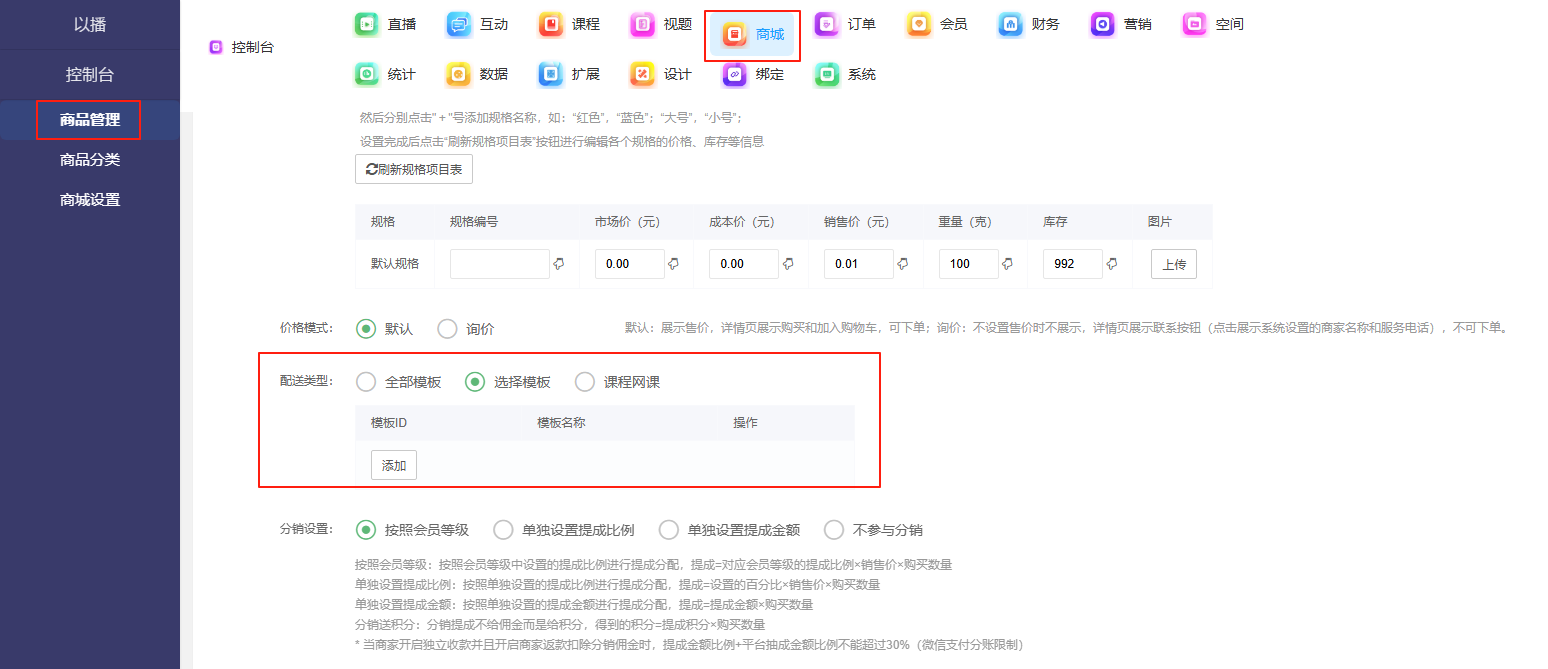 目录 搜索 展开 一、直播前的准备工作1.1.添加主播1.2.添加商品1.2.1.商品标题规范1.2.2.直播间支付解析1.2.3.添加商品分类1.2.4.pc电脑端添加商品1.2.5.手机主播端添加商品1.3.添加外链1.4.添加课程1.5.添加视频(录播/伪直播需要)1.6.添加题库(普通题库、视频题库)1.7.添加优惠券1.8.添加直播间管理员1.9.添加大转盘1.10.积分1.11.红包记录1.12.扩展投票活动1.13.设置快递1.14.添加配送方式1.15.绑定小程序1.16.绑定公众号二、创建直播间2.1.创建手机直播间2.1.1.手机创建手机直播间2.1.2.电脑创建手机直播间预告2.1.3.创建连麦直播间2.2.创建OBS/pc直播2.3.创建录播直播间2.3.1.创建答题直播间2.4.创建伪直播直播间三、给直播间添加商品或外链3.1.电脑端给直播间添加在售商品和讲解卡片3.2.主播端添加在售商品和讲解卡片3.3.给直播间添加在售外链3.4.给直播间添加在售课程四、直播间相关功能/控制4.1.直播间拉黑/禁言用户4.1.1.电脑pc端禁言4.1.2.手机端禁言4.2.直播间发红包/积分/优惠券4.2.1.主播发放优惠券/红包/积分4.2.2.pc端推送优惠券到直播间4.2.3.用户端领取4.2.4.用户发红包4.2.5.直播间发倒计时红包4.2.6.直播间管理发倒计时红包4.2.7.直播间管理员发积分4.3.直播发签到奖励:红包/积分/优惠4.4.直播间清晰度调整4.5.直播间配置调整4.6.直播间添加大转盘4.7.直播间评论区发图片4.8.直播转为伪直播4.9.直播间机器人氛围组4.9.1.添加机器人和评论组/虚拟购买4.9.2.机器人批量/随机发送评论4.9.3.导入机器人评论组4.10.直播间开启长期直播,链接不变4.11.直播间开启录制,视频可回放观看4.12.给用户下发课程链接4.13.下单课程时弹出客服二维码五、直播间更换域名5.1.后台绑定新域名5.2.服务号更换域名5.3.商户号更换域名六、分享直播间(分销)6.1.默认分销比例设置6.2.单独给商品设置分销6.3.上下级关系形成6.4.h5电脑分享直播间6.5.h5手机分享直播间6.6.微信内跳转浏览器打开直播间6.7.下载app打开直播间6.8.小程序打开直播间6.9.查看自己的推荐分享6.9.1.电脑端:有两个查看方式6.9.2.手机端,会员自己查看自己的推荐和业绩6.10.团队管理/pc端查看管理七、订单发货、售后退款7.1.订单发货、退款、状态修改7.2.商家批量发货八、门店8.1.添加门店8.2.给商品添加门店自提和快递邮寄8.3.门店邀请8.4.门店核销 暂无相关搜索结果! 阅读次数:1 本文档使用 MinDoc 发布 8.2.给商品添加门店自提和快递邮寄 作者:admin 创建时间:2026-01-14 18:55最后编辑:admin 更新时间:2026-01-14 20:13