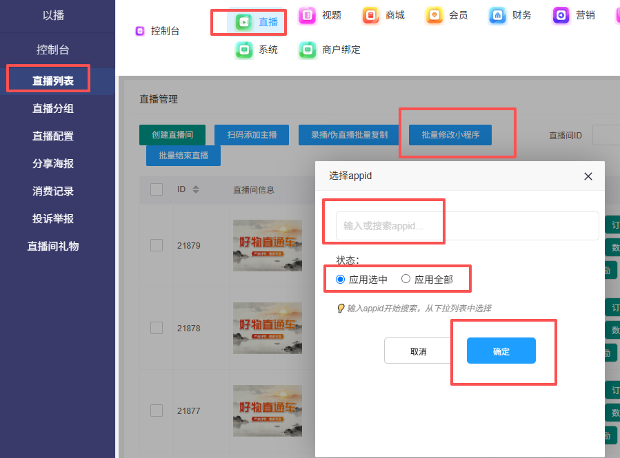 目录 搜索 展开 一、直播前的准备工作1.1.添加主播1.2.添加商品1.2.1.商品标题规范1.2.2.直播间支付解析1.2.3.添加商品分类1.2.4.pc电脑端添加商品1.2.5.手机主播端添加商品1.3.添加外链1.4.添加课程1.5.添加视频(录播/伪直播需要)1.6.添加题库(普通题库、视频题库)1.7.添加优惠券1.8.添加直播间管理员1.9.添加大转盘1.10.积分1.11.红包记录1.12.扩展投票活动1.13.设置快递1.14.添加配送方式1.15.绑定小程序1.16.绑定公众号二、创建直播间2.1.创建手机直播间2.1.1.手机创建手机直播间2.1.2.电脑创建手机直播间预告2.1.3.创建连麦直播间2.2.创建OBS/pc直播2.3.创建录播直播间2.3.1.创建答题直播间2.4.创建伪直播直播间2.5.批量复制创建直播间三、给直播间添加商品或外链3.1.电脑端给直播间添加在售商品和讲解卡片3.2.主播端添加在售商品和讲解卡片3.3.给直播间添加在售外链3.4.给直播间添加在售课程四、直播间相关功能/控制4.1.直播间拉黑/禁言用户4.1.1.电脑pc端禁言4.1.2.手机端禁言4.2.直播间发红包/积分/优惠券4.2.1.主播发放优惠券/红包/积分4.2.2.pc端推送优惠券到直播间4.2.3.用户端领取4.2.4.用户发红包4.2.5.直播间发倒计时红包4.2.6.直播间管理发倒计时红包4.2.7.直播间管理员发积分4.3.直播发签到奖励:红包/积分/优惠4.4.直播间清晰度调整4.5.直播间配置调整4.6.直播间添加大转盘4.7.直播间评论区发图片4.8.直播转为伪直播4.9.直播间机器人氛围组4.9.1.添加机器人和评论组/虚拟购买4.9.2.机器人批量/随机发送评论4.9.3.导入机器人评论组4.10.直播间开启长期直播,链接不变4.11.直播间开启录制,视频可回放观看4.12.给用户下发课程链接4.13.下单课程时弹出客服二维码五、直播间更换域名5.1.后台绑定新域名5.2.服务号更换域名5.3.商户号更换域名六、分享直播间(分销)6.1.默认分销比例设置6.2.单独给商品设置分销6.3.上下级关系形成6.4.h5电脑分享直播间6.5.h5手机分享直播间6.6.微信内跳转浏览器打开直播间6.7.下载app打开直播间6.8.小程序打开直播间6.9.查看自己的推荐分享6.9.1.电脑端:有两个查看方式6.9.2.手机端,会员自己查看自己的推荐和业绩6.10.团队管理/pc端查看管理七、订单发货、售后退款7.1.订单发货、退款、状态修改7.2.商家批量发货八、门店8.1.添加门店8.2.给商品添加门店自提和快递邮寄8.3.门店邀请8.4.门店核销九、添加管理员、添加部门9.1.添加管理员9.2.添加部门十、OBS使用教程10.1.下载安装OBS10.2.设置OBS10.3.OBS直播PPT10.4.调整OBS直播画面清晰度10.5.OBS套用YY美颜插件十一、小程序相关11.1.添加成员11.2.版本管理解除授权11.3.生成appid等参数11.4.修改介绍和类目11.5.更换小程序(管理员绑定小程序)11.6.批量修改小程序(直播间绑定)十二、统计12.1.直播数据12.2.用户时长十三、常见问题 暂无相关搜索结果! 阅读次数:10 本文档使用 MinDoc 发布 11.6.批量修改小程序(直播间绑定) 作者:admin 创建时间:2026-01-31 17:14最后编辑:admin 更新时间:2026-01-31 17:14