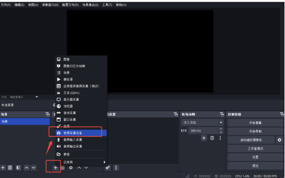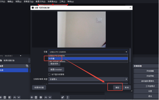 • 步骤2:启动OBS,点击【来源】→【+】→【视频采集设备】,设备选择“YY开播”。
